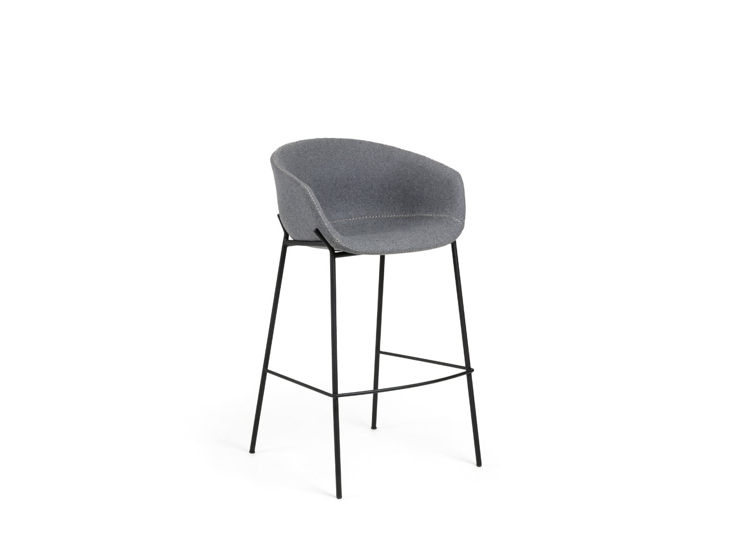 Zadine barstool is constructed of a foam seat which is fully upholstered in a grey fabric with stitching detail and black powder coated metal legs. The seat height is 65cm with an overall height of 90cm